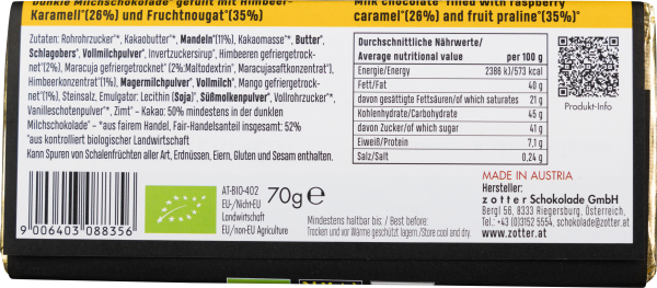 Das herrliche Spiel der Nougatsüße mit der Fruchtsäure überzeugt selbst jene, die nicht an Schokolade mit Früchten glauben. Wenn Sie das Himbeer-Karamell, das Mandelnougat, die Mango-, Maracuja- und Himbeerfrüchte und die Himbeer-Crispies erst in Aktion erlebt haben, gibt es kein Zurück mehr.